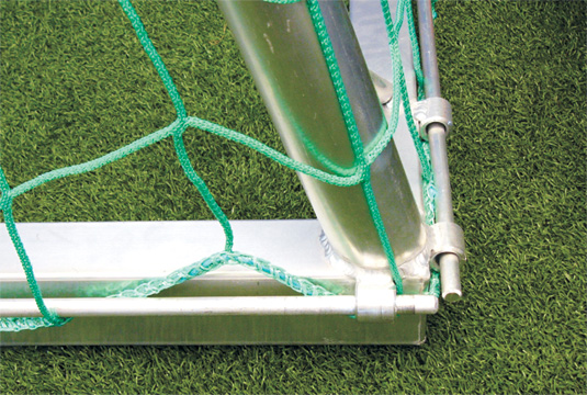 Ochrana sítě v podobě hliníkových kulatin upevní síť ke spodnímu rámu branky spolehlivěji než provaz standardně dodávaný se sítěmi.